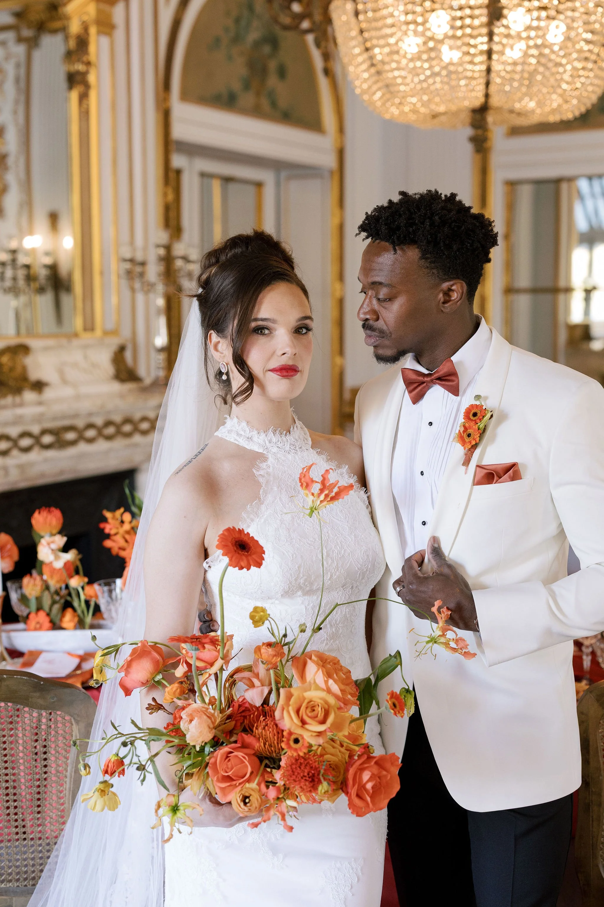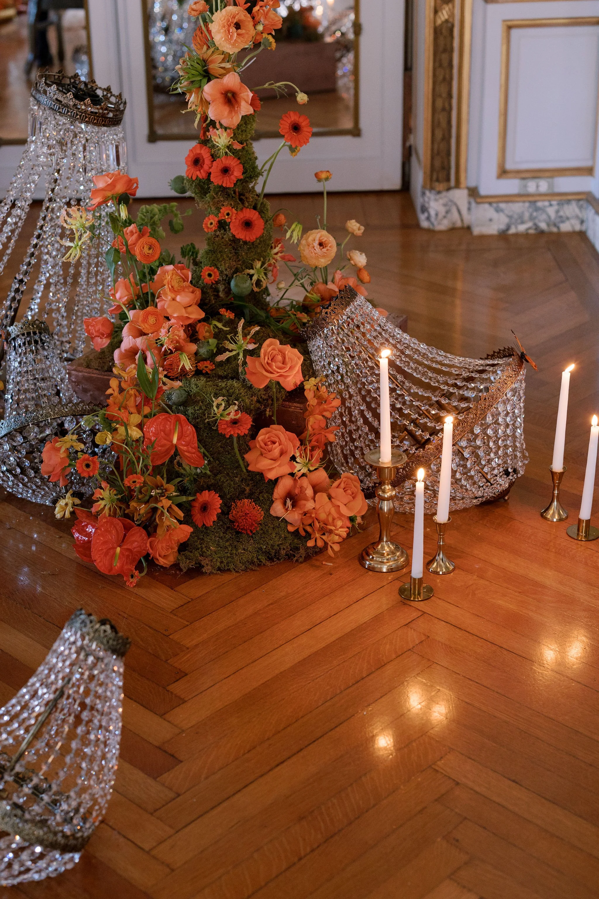 An opulent vision where glowing candlelight and a golden encrusted room set the stage for something far more unexpected. Vibrant orange announces itself, while gilded details, ornate statues woven into the tablescape, and chandeliers stretch across the table and floor created a sense of immersive, almost surreal luxury. Butterfly motifs added movement and intrigue throughout, resulting in a design that felt rich, expressive, and unapologetically dramatic.